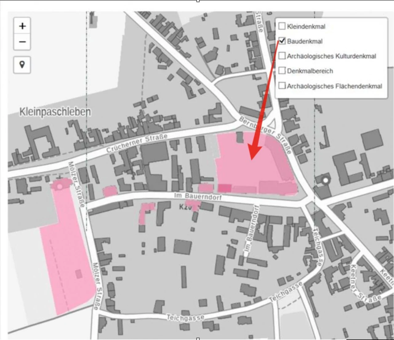 Das Gebäude ist nach Angabe des Auftraggebers in der Denkmalschutzliste des Landkreises Anhalt-Bitterfeld erfasst. In diesem teilunterkellerten Gebäude befinden sich im Erdgeschoss die Räume einer bis 2022 betriebene Arztpraxis, ein Hofladen (ehemals Sparkassenfiliale), ein bis Ende 22 betriebener Friseurladen und weitere Räumlichkeiten im Obergeschoss. Hier findet sich auch ein früher als Gemeindesaal genutzter großer Raum.